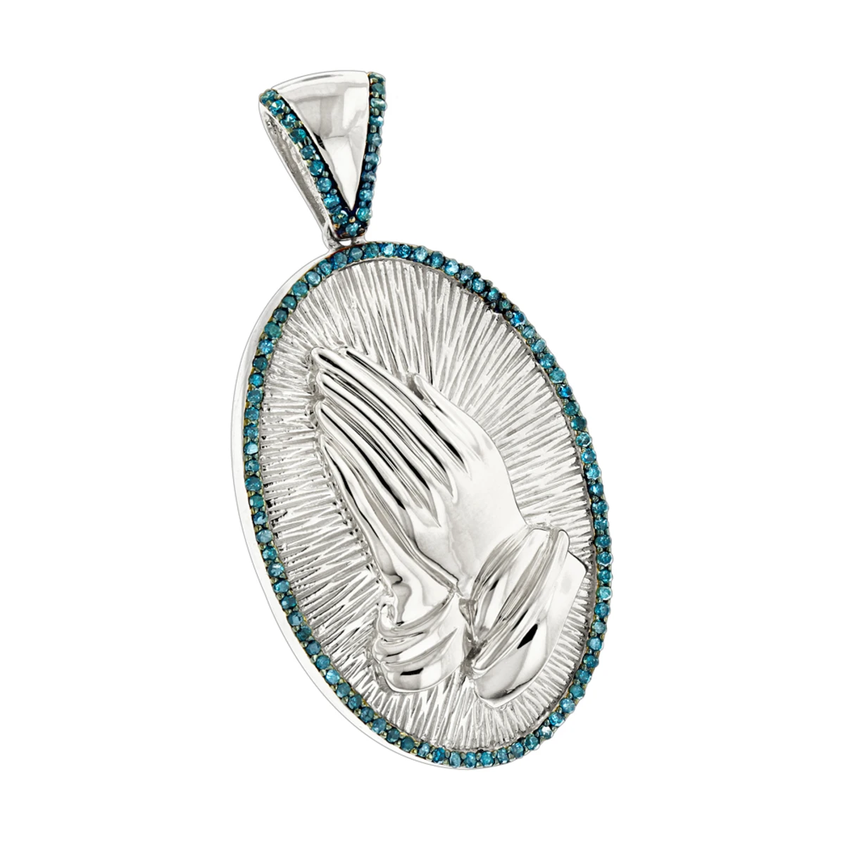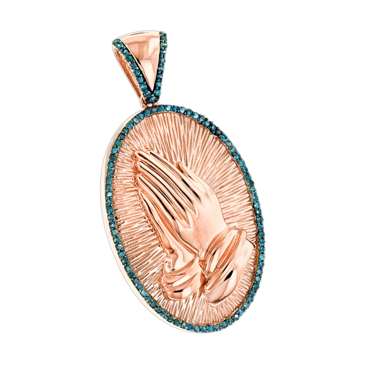 Religious Jewelry: This 10K Gold Blue Diamond Praying Hands Pendant weighs approximately 5 grams and showcases 0.36 carats of sparkling round blue diamonds. Featuring a highly polished and textured gold combination, this praying hands diamond pendant is available in 10K white, yellow and rose gold. You also can personalize this piece or check we’ve already made and create your own design.