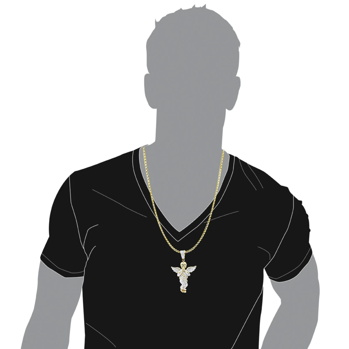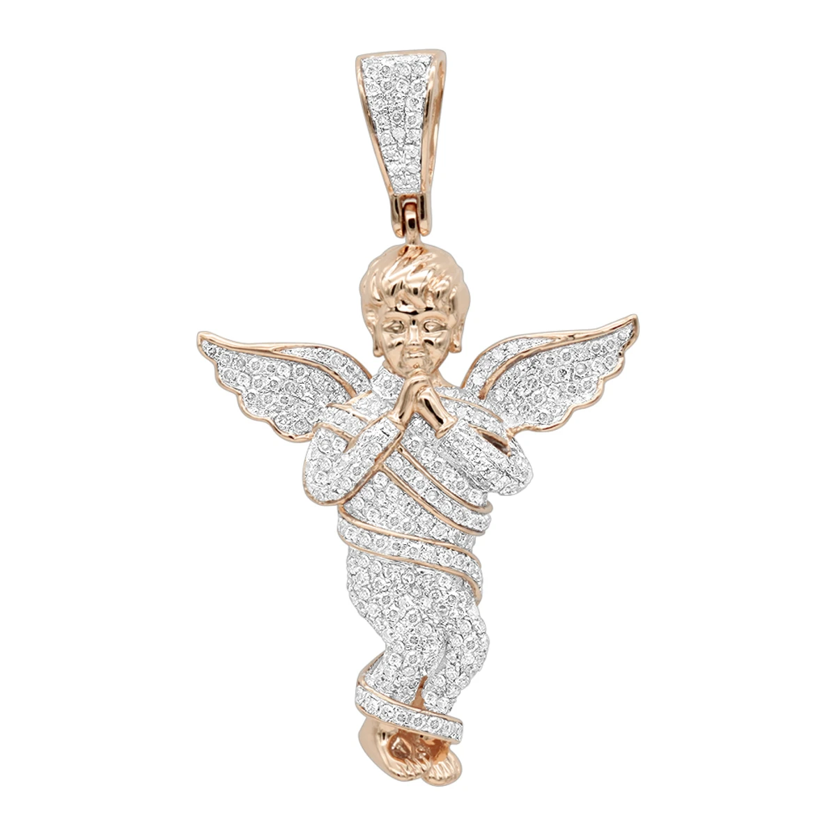 This luxurious solid 10K Gold Diamond Baby Angel Pendant for Men by Luxurman weights approximately 6 grams and showcases 1 carat of dazzling round cut white diamonds masterfully pave set in highly polished gold frame. Featuring a detailed angel design this diamond angel pendant is available in 10K yellow, white a rose gold. The bail in this diamond angel pendant is about 5mm by 5mm, if you would like to fit a larger chain please make a note during checkout about your chain size and we will adjust the bail bot fit your chain. You also can personalize this piece or check we’ve already made and create your own design.