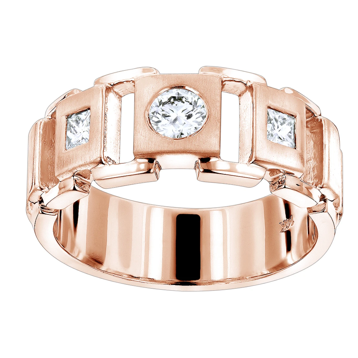 This stunning 14K Gold Men’s Princess Cut Diamond Wedding Ring weighs approximately 14 grams and displays a dazzling round brilliant center diamond accentuated by 2 sparkling princess cut diamonds, each expertly bezel set in luscious 14K gold. This luxurious men’s diamond band features a comfort-fit gold frame and 0.69 ctw of exquisite diamonds.