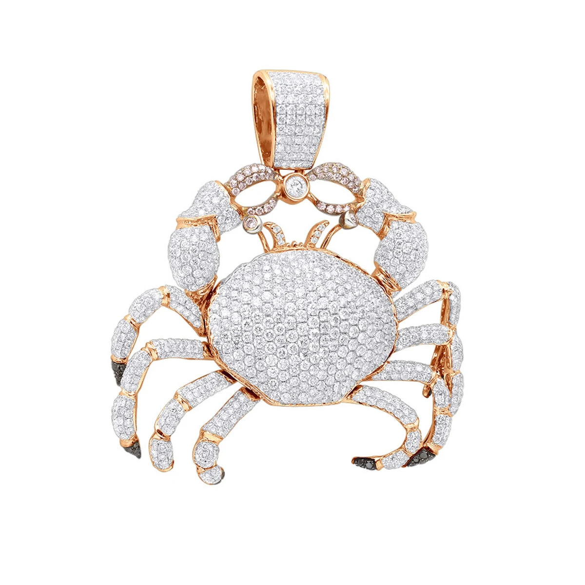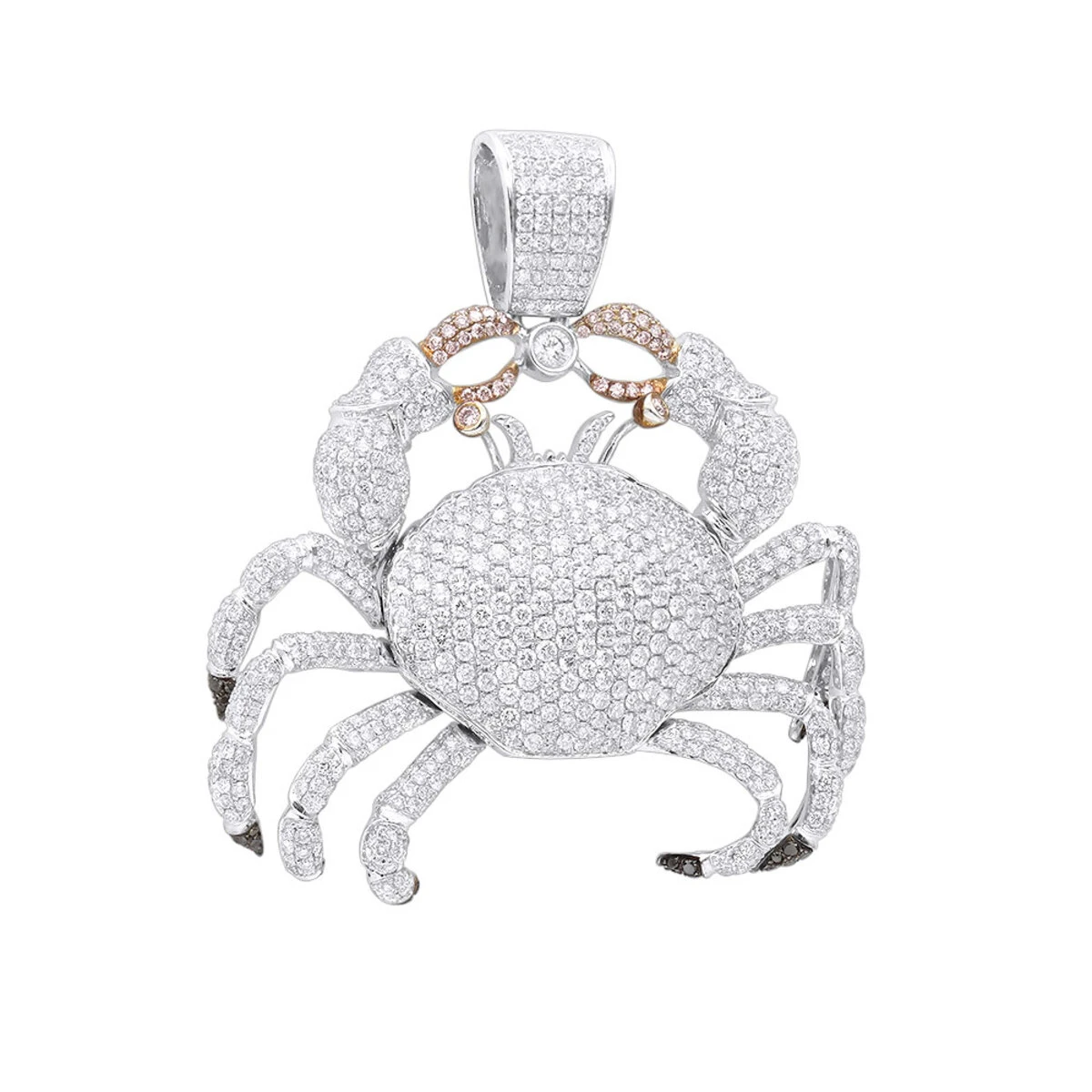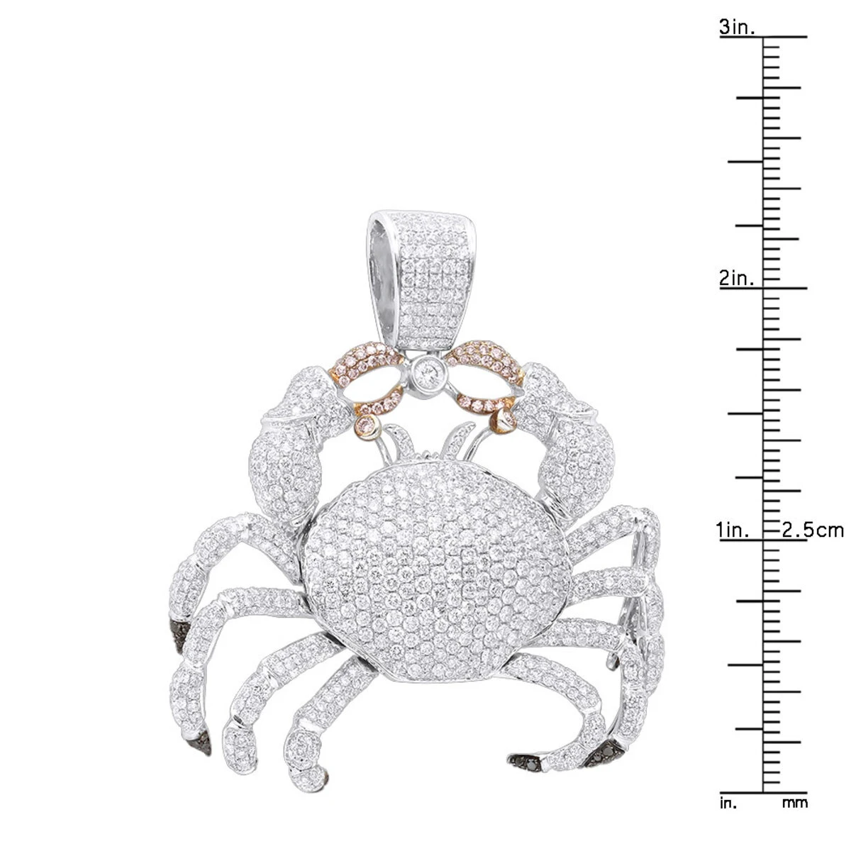 From our men’s diamond pendants collection: This incredible 14K Gold Iced Out Diamond Cancer Pendant for Men appears almost alive with its claws moving! It’s your time to shine with this extraordinary one of a kind diamond pendant in a shape of a greedy crab which is carrying a precious round white diamond, the biggest in this sparkling composition. With a fully iced out design, pink diamonds in its eyes and upper claws, black diamonds at the end of each smaller claw and a gorgeous diamonds encrusted bail, this diamond cancer pendant will leave a long lasting impression on everyone who sees you wearing it. This amazing diamond pendant for men features a total of 10.46 carats of VS quality diamonds, weight of the pendant is approximately 28 grams, it is available in 14K white gold and will definitely look very unique and simply amazing, comes in a beautiful packaging! You also can personalize this piece or check we’ve already made and create your own design.