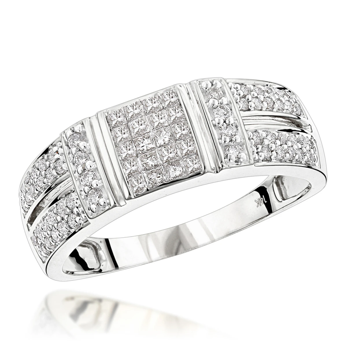 This remarkable 14K Gold Diamond Ring with Round Princess Diamonds weighs approximately 5 grams and features 0.85 ctw of invisibly set princess cut diamonds and pave set round diamonds. This fabulous unisex diamond ring makes a unique diamond wedding band, and is available in 14K white, yellow and rose gold.
