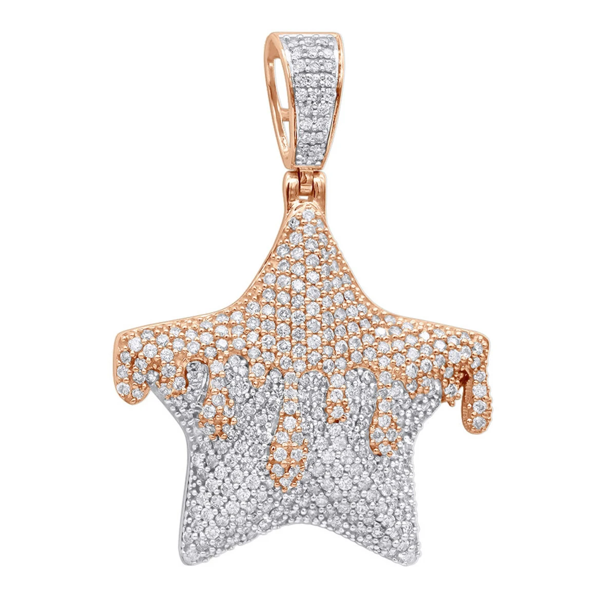 From our men’s diamond pendants and real hip hop jewelry collections: This 3D Design fully iced out Diamond Drop Star Pendant for men is made in solid in 14K gold featuring impressive 3 Carats of genuine white diamonds and can be worn by both men and women who like large pendants, the pendant is really made to stand out with its large size and modern and fashionable design. The main spice of this iced out pendant is it’s unique 3D design with the top layer of diamonds appearing to be melting the bottom part! Measuring 45mm in length and 33mm in width, the pendant also showcases a beautiful diamond incrusted bail. This diamond star pendant has fiery luminescence and will speak volumes about the taste of it’s owner. It is available in 14K white, yellow or rose gold and will be a show stopper in any color. You also can personalize this piece or check we’ve already made and create your own design.