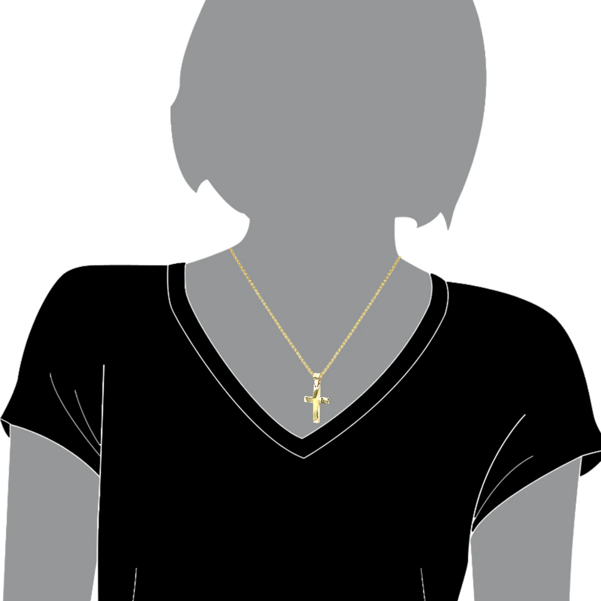 From our religious jewelry collection The timeless silhouette of this 14K gold small cross pendant by LUXURAN is accentuated by its highly polished gold finish. This 14k gold pendant features a simple and stylish highly polished design and makes a terrific present that can be worn by both men and women, the cross is just under an inch and a half long with bail: is 1 7/16in (36mm), and 3/4in (19mm) wide, weighs approximately 5 grams. This elegant gold cross pendant is available in 14K white, yellow and rose gold and will definitely look amazing in any color. Combine it with one of the gold chains we offer such as https://www.itshot.com/miami-yellow-gold-cuban-link-curb-chain-14k-15mm-22-40in to make it into necklace. You also can personalize this piece or check we’ve already made and create your own design.