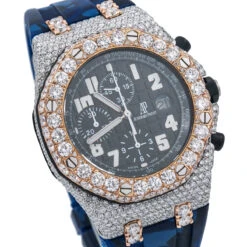 From our iced out watches collection: This remarkable Hublot Big Bang Men’s Diamond Watch features a 44mm rose gold case and a bust down design with stunning diamond dial showcasing 18.09 total carat weight of high quality pave set round diamonds is a truly impressive timepiece. With it’s black sides for the most masculine look and a fully iced out design – bezel, lugs, band and clasp are all encrusted with white sparkling diamonds – this watch will only suit true connoisseurs. The intricate dial showcases black numbers and hour markers, 3 sub dials and even a date display and is absolutely dazzling above all. Expertly crafted to meet the highest industry standards, this Hublot watch is also conveniently water resistant to 30 meters (100ft), it will last you a lifetime and become your faithful companion. Please note: this men’s diamond Hublot watch is pre-owned, in excellent condition and comes with a full 2 year warranty from ItsHot.com.