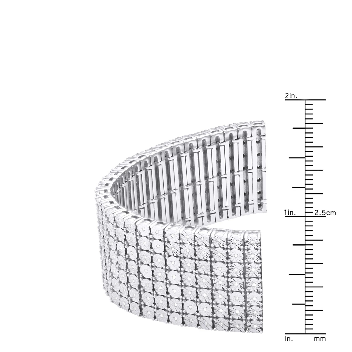 This 7 Row Diamond Bracelet for Men in Sterling Silver weighs approximately 100 grams and showcases 1.20 carats of genuine diamonds. Featuring a trendy cuff design and a luxurious rhodium plating for extra shine, this men’s silver diamond bracelet is an affordable alternative to gold jewelry.