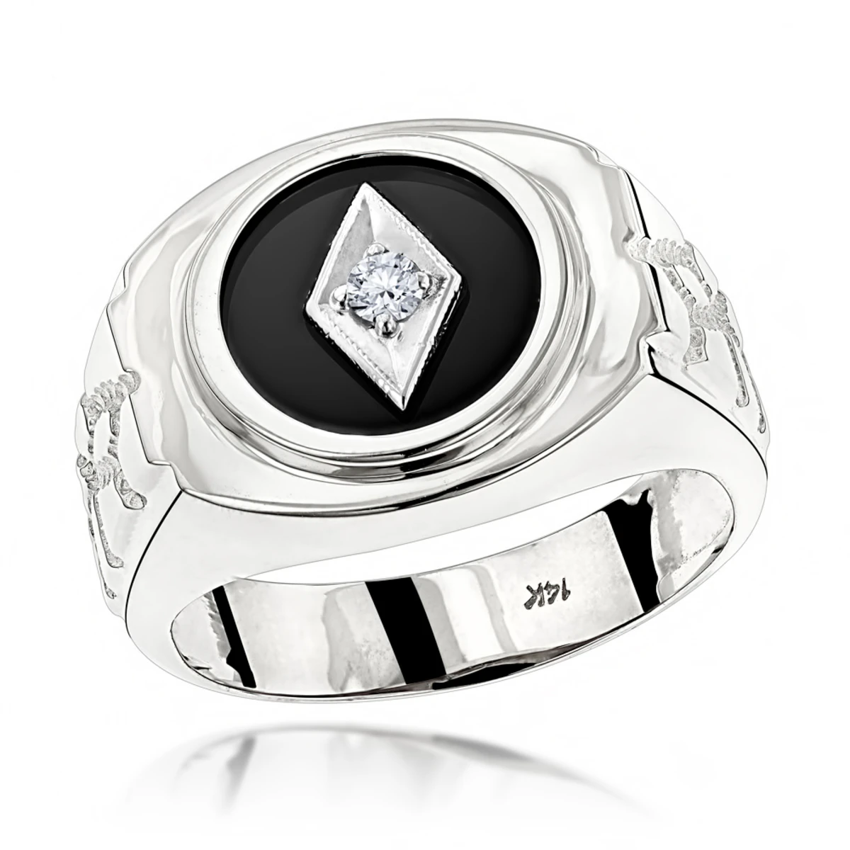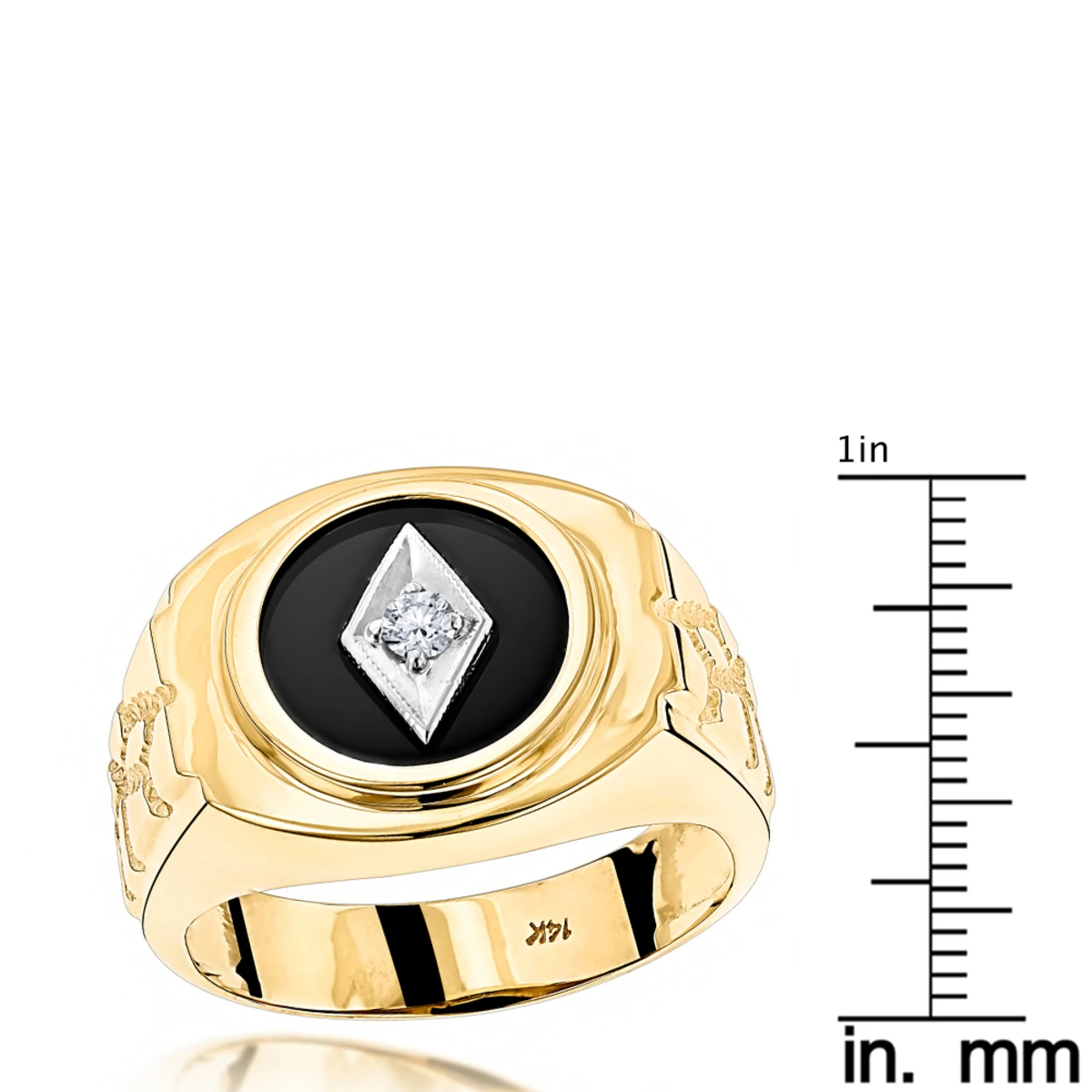 Luxurious Black Onyx and Diamond Rings! This 14K Gold Men’s Ring weighs approximately 9 grams and showcases a beautiful black onyx and a prong-set, 0.10-carat round diamond in the center. Featuring a highly polished and textured gold finish, this men’s black onyx and diamond ring is available in your choice of 14K white, yellow and rose gold, and makes a perfect gift for any occasion.