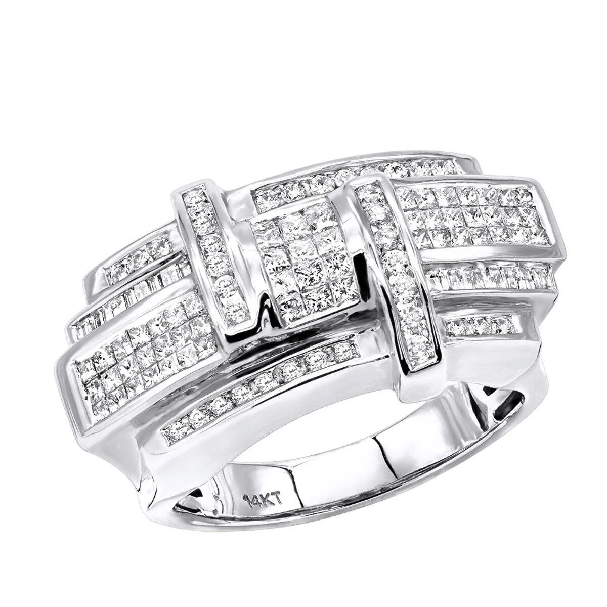 Closeout ring: This exquisite Designer 14K Yellow Gold Men’s Diamond Criss Cross Ring showcases 2.5 carats of sparkling invisibly-set princess cut diamonds and channel-set round & baguette diamonds. Featuring an intricate criss cross design and a highly polished gold finish, this designer men’s diamond ring is available in 14 Karat yellow gold only.