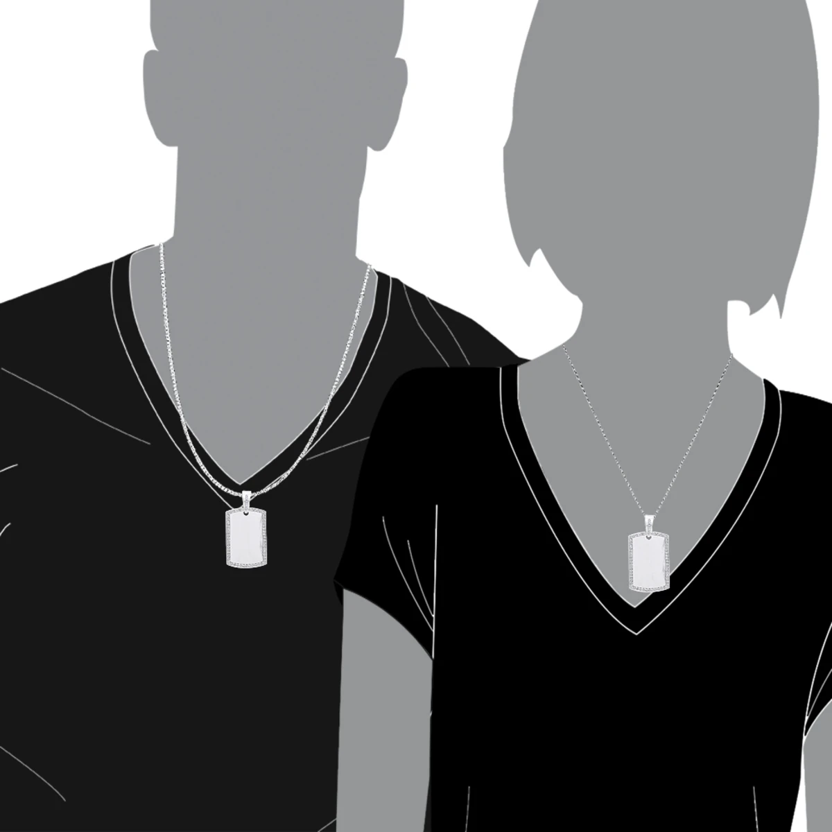 This Diamond Dog Tag Pendant in Sterling Silver weighs approximately 8 grams and showcases 0.48 carats of genuine diamonds. Featuring a luxurious design and a rhodium plating for extra shine, this diamond pendant can also be personalized with engraved initials, name, special date, or even a picture. Most of our diamond dog tags can also be customized with fancy color diamonds, please contact us for details. Chain must be purchased separately. You also can personalize this piece or check we’ve already made and create your own design.