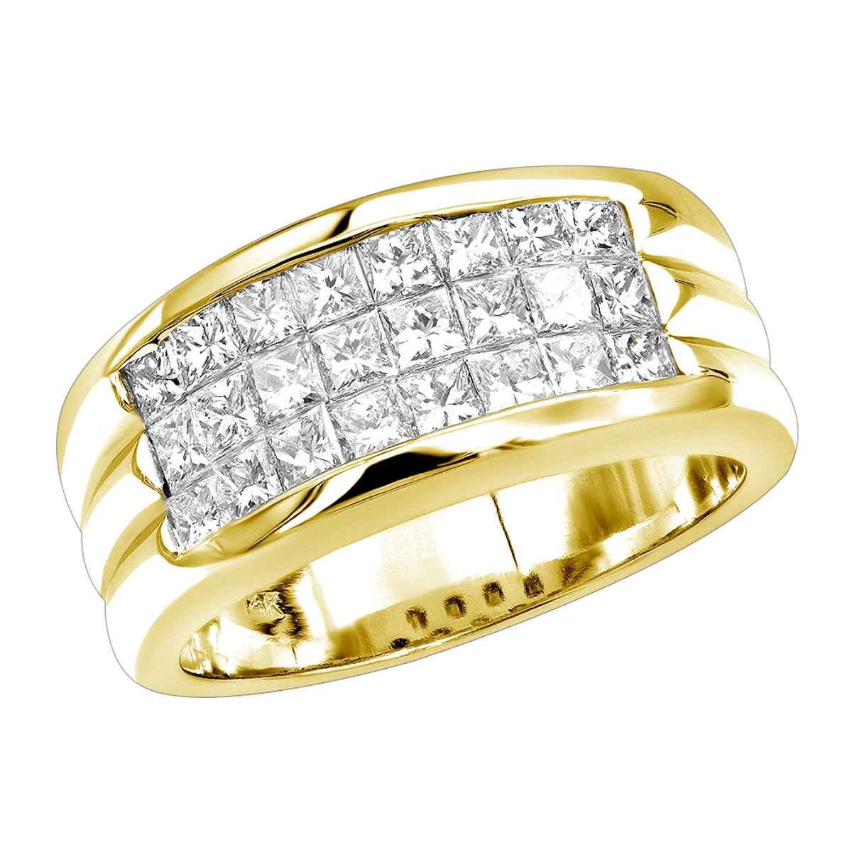 This handsome men’s diamond ring by LUXURMAN is crafted in highly polished precious 14K gold and can also be used a diamond wedding band, the ring is decorated with three rows of miraculously sparkling invisible set princess cut diamonds of G color VS quality ( 2 1/2 carat). The ring is featuring a classy styled design which makes it highly versatile and a great present as it can be worn as a regular men’s ring, pinky ring or a wedding band. Its is 10mm wide and is available in 14k Yellow, White and Rose Gold as well as can be custom made in 18k gold and Platinum. Express your personality with this stunning diamond ring, we guarantee – all compliments are yours!