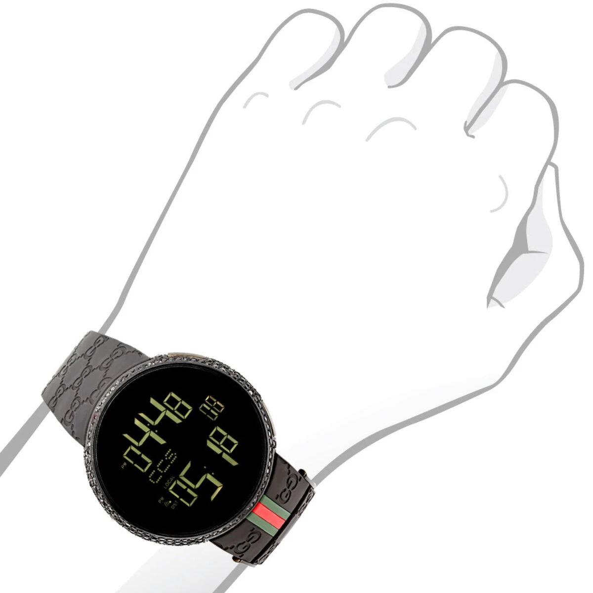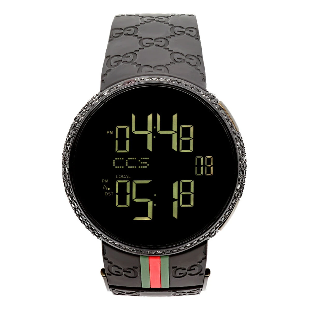 This Genuine Men’s Gucci Watch with Black Diamonds features 6 carats of black diamonds around the black tone stainless steel case, a scratch-resistant sapphire crystal, a rubber band with a Gucci logo motif, and a digital dial code. This diamond Gucci watch showcases a fine Swiss-made quartz Movement and is water-resistant to 30 m (100 ft).
