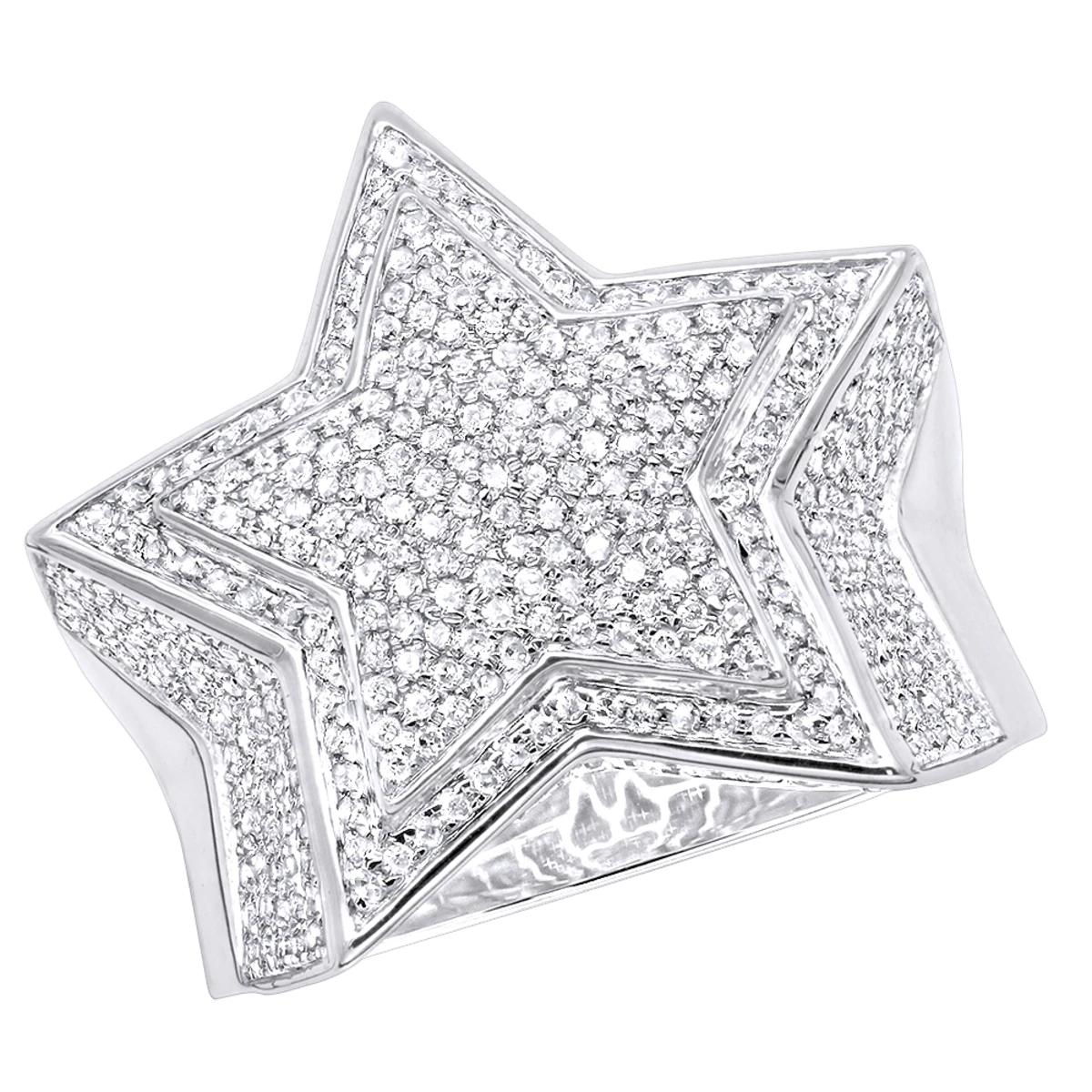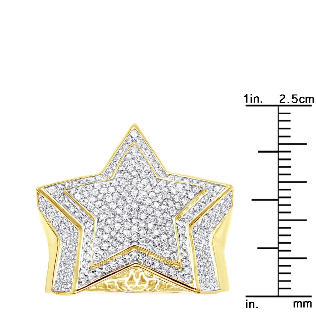 From our hip hop jewelry collection: This 10K Gold Hip Hop Diamond Ring for Men is featuring a massive five-pointed star within a star design fully covered with 1.5 carats of sparkling pave set round diamonds including sides of the ring. Five-pointed star is one of the greatest hip hop symbols of all times. This men’s diamond ring is showcasing a large 3D star with an outlined contour of the star in the center which is making it even more vibrant. This style also makes it a perfect pinky ring. The ring is available in Yellow, White and Rose Gold and is sure to stand out being nearly an inch wide: 7/8in. (23mm).