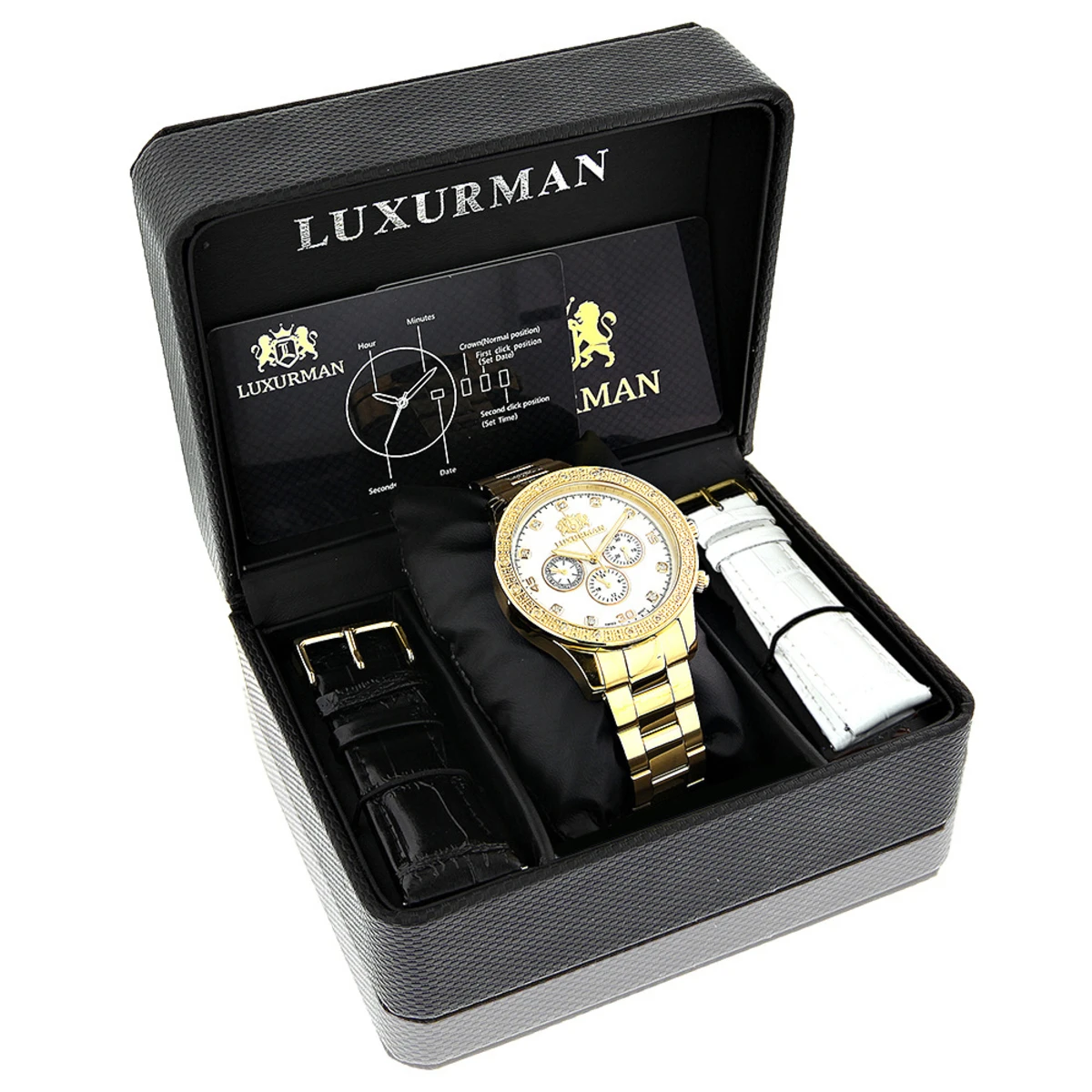 Luxurman Watches for Men collection: This Luxurman Men’s Diamond Watch White MOP Liberty is 18K Yellow Gold Plated and features 0.2 carats of genuine diamonds. Showcasing a luxurious white mother of pearl face, a yellow gold plated stainless steel case, yellow gold plated stainless steel band and Swiss movement this Luxurman Liberty men’s diamond watch is conveniently water-resistant to 3 ATM and comes with a 5 year manufacturers warranty. This stylish men’s Luxurman watch makes a perfect gift for any occasion! The watch also includes two extra leather bands in different colors.
