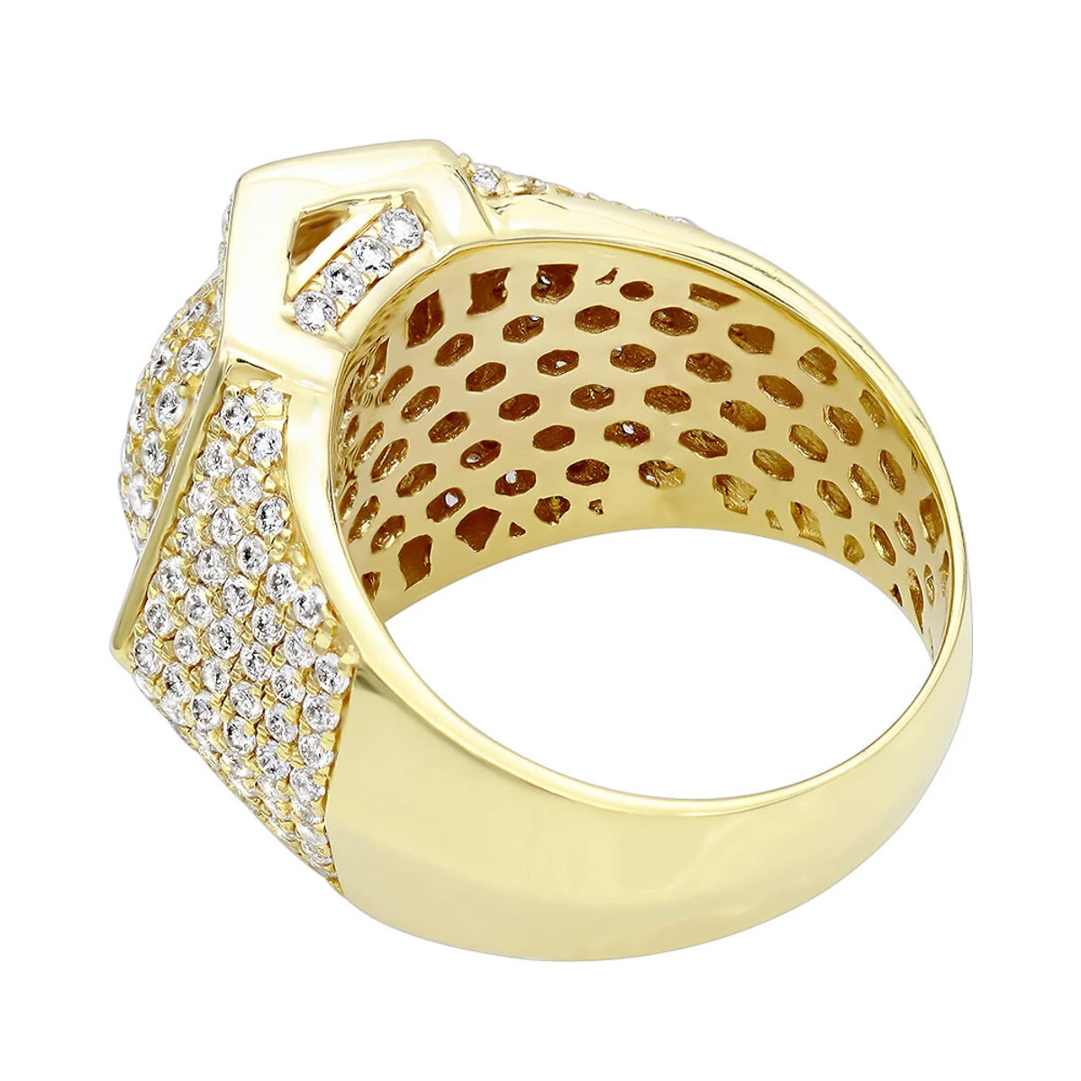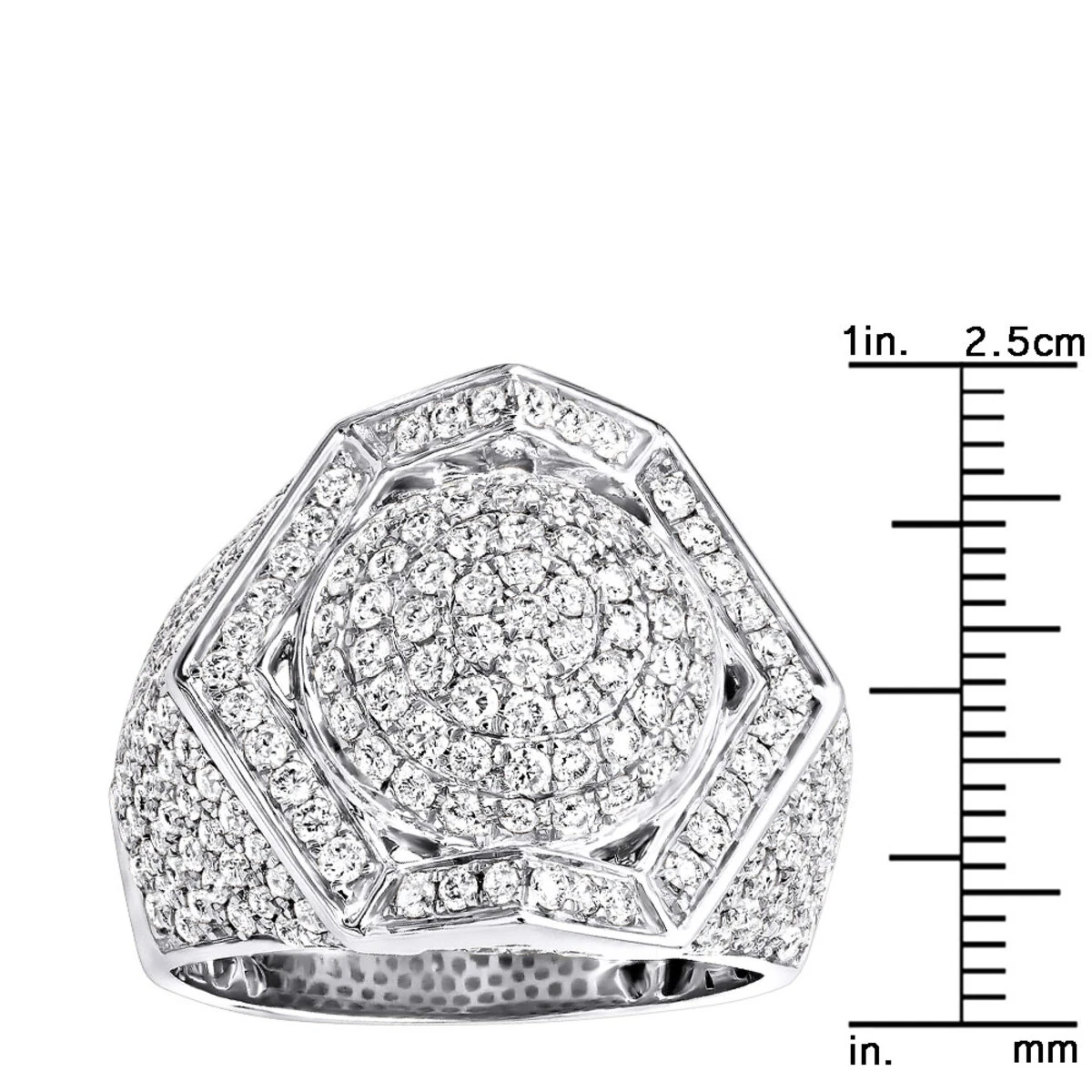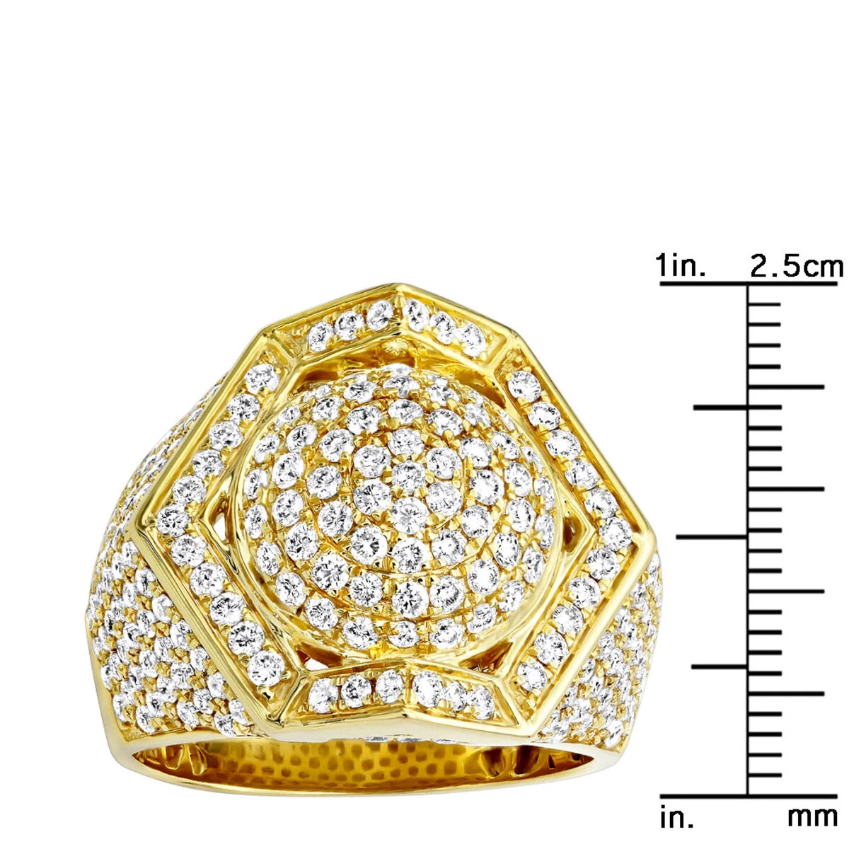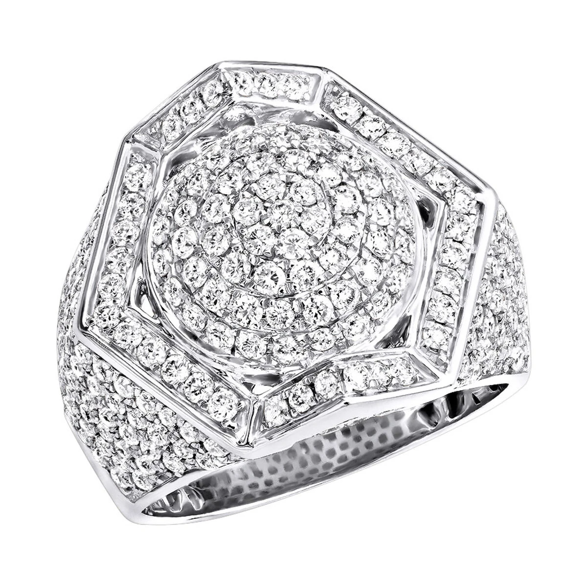 Luxurman unique men’s diamond rings collection: This 14k gold men’s 3.5 carat diamond ring features a unique octagon outer shape with a dome in the middle, done in solid 14k gold and decorated with 3.5 carats of diamonds professionally pave set this diamond ring for men makes a unique gift and can also be worn as a pinky ring.