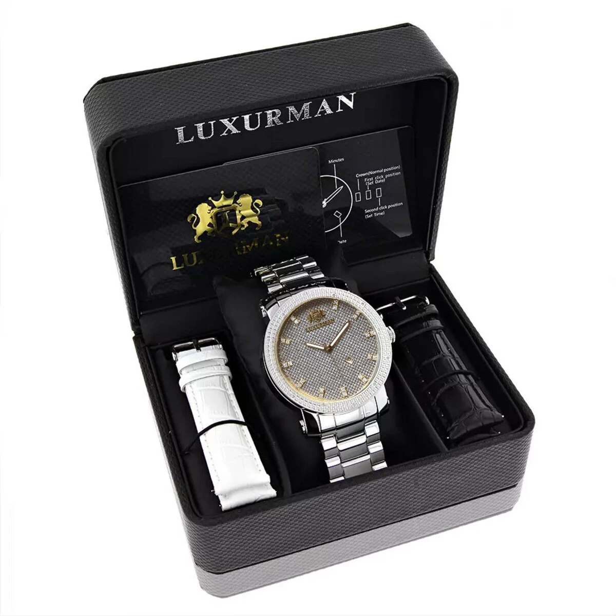 This Luxurman Men’s Diamond Watch 0.12ct Two-Tone Gold Plated Stainless Steel is a limited addition men’s wrist watch and features 0.12 carats of genuine diamonds around the bezel, a polished white gold plated stainless steel case with a stainless steel band and a yellow plated dial for a two-tone look. This Luxurman diamond watch for men is water-resistant and makes a fabulous gift for any occasion.