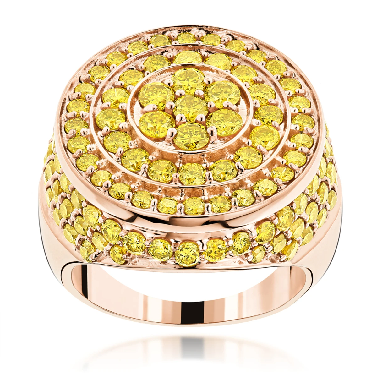 This Massive 14K Gold Round Yellow Diamond Circle Ring for Men weighs approximately 17 grams and showcases 4.45 carats of dazzling yellow diamonds masterfully set in 14K solid gold. Featuring luxurious design and a highly polished gold finish, this iced out men’s diamond ring is available in 14K white gold, yellow gold and rose gold as well as 18K gold and Platinum as a custom order. This round yellow diamond ring for men can also be customised with different metals and diamond colors (white, yellow, pink, black and blue diamonds), please contact us at 212-398-3123 if desired options are not listed.