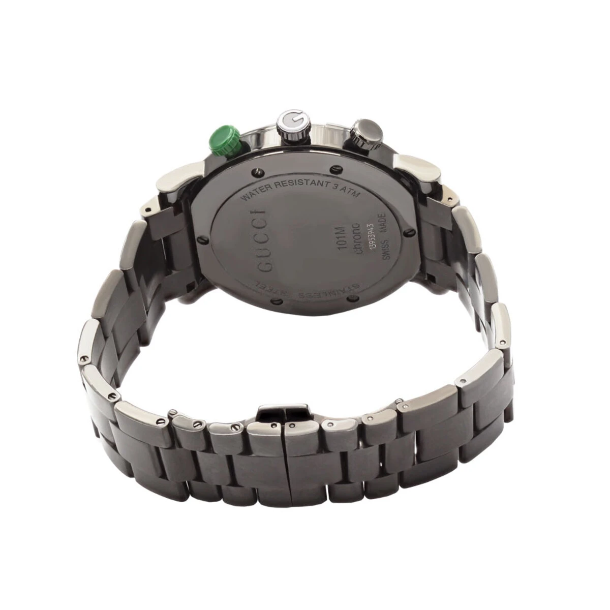 This men’s Diamond Gucci fully Iced out watch 101G Black YA101331 is a stunning timepiece that is sure to turn heads. The watch features a black stainless steel case and bracelet with a black dial and white and green hands. This Gucci diamond watch bezel and bracelet are set with 7.5 carats of white diamonds, giving the watch a luxurious and eye-catching look. The watch is powered by a Swiss-Quartz movement and is water resistant up to 30 meters. The dial window is coated with sapphire and is scratch resistant, making it a durable and reliable timepiece. The watch also features chronograph functions, allowing you to keep track of time with ease. This watch is perfect for any man who wants to make a statement with their timepiece. With its unique and stylish design, this men’s Chrono Gucci watch for men is sure to be a conversation starter.