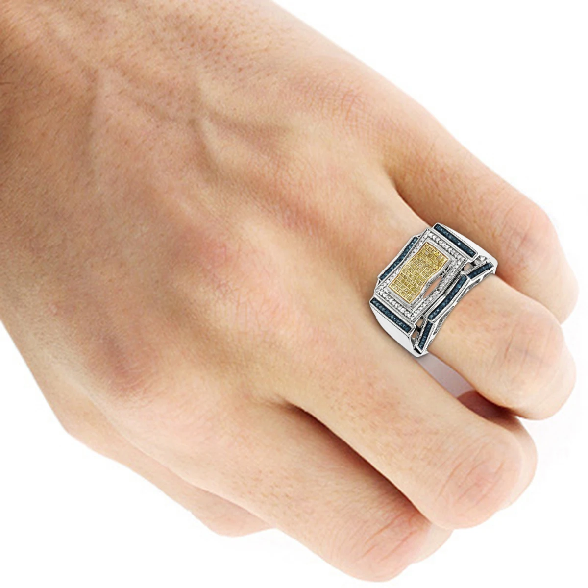 This stunning Men’s Color Diamond Ring is crafted from sterling silver and features a total of 0.5 carats of sparkling diamonds. The diamonds come in a mix of white, blue, and yellow colors, and are SI-I in clarity. The setting type is a pave setting, and the width of the ring is 5/8 inches (16mm). This piece of jewelry comes with a 1 year warranty. This handsome diamond ring is the perfect way to show your love and commitment to the special man in your life.