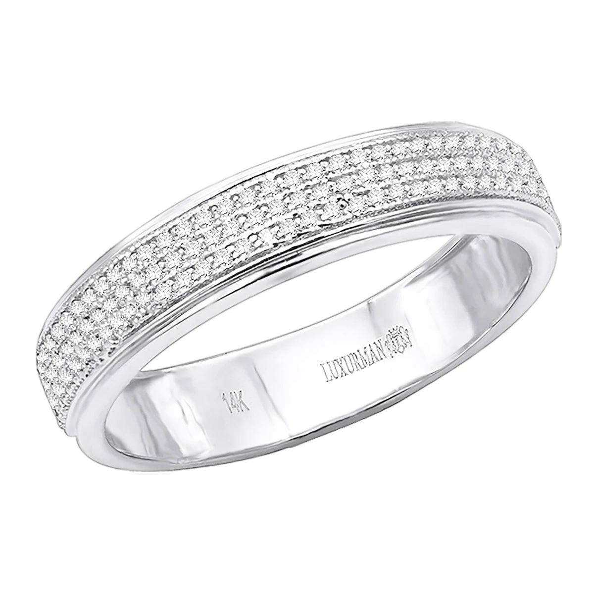 Affordable Men’s Diamond Bands! This 14K Gold Diamond Ring weighs approximately 4 grams and showcases 0.2 carats of sparkling round diamonds. Featuring a 3-row design and a highly polished gold finish, this men’s diamond ring is available in 14K white, yellow and rose gold.