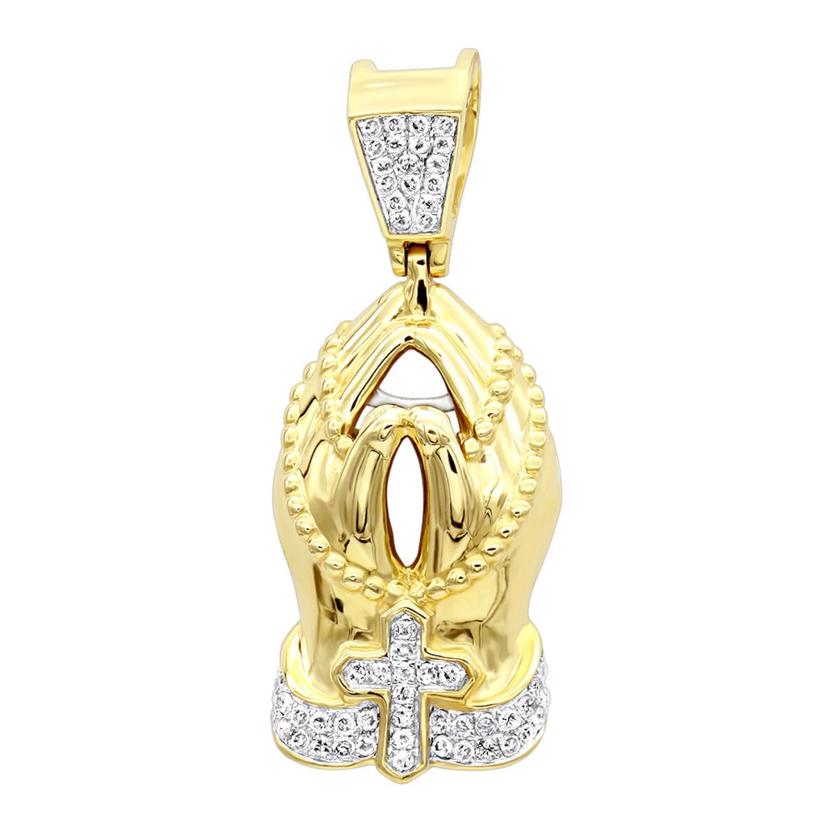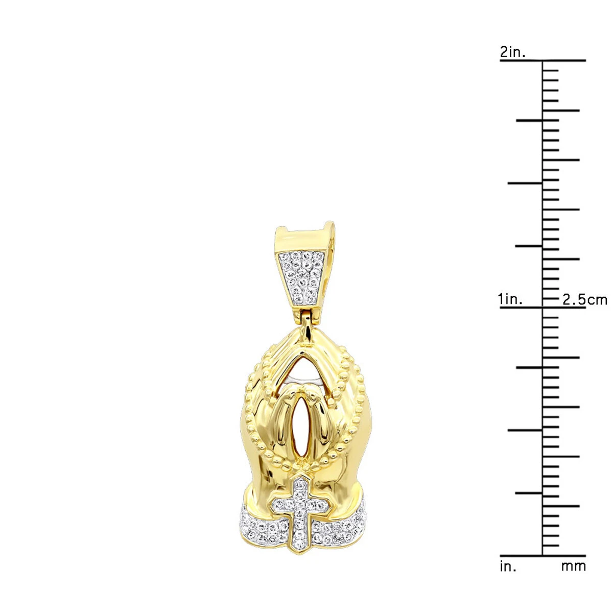 Mini Praying Hands And Cross Diamond Pendant For Men 10K Yellow Gold 0.25ct