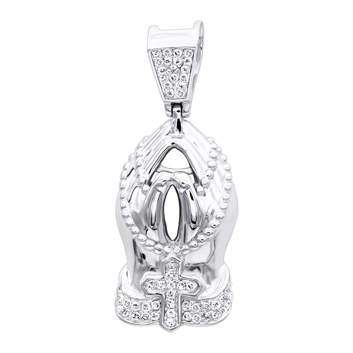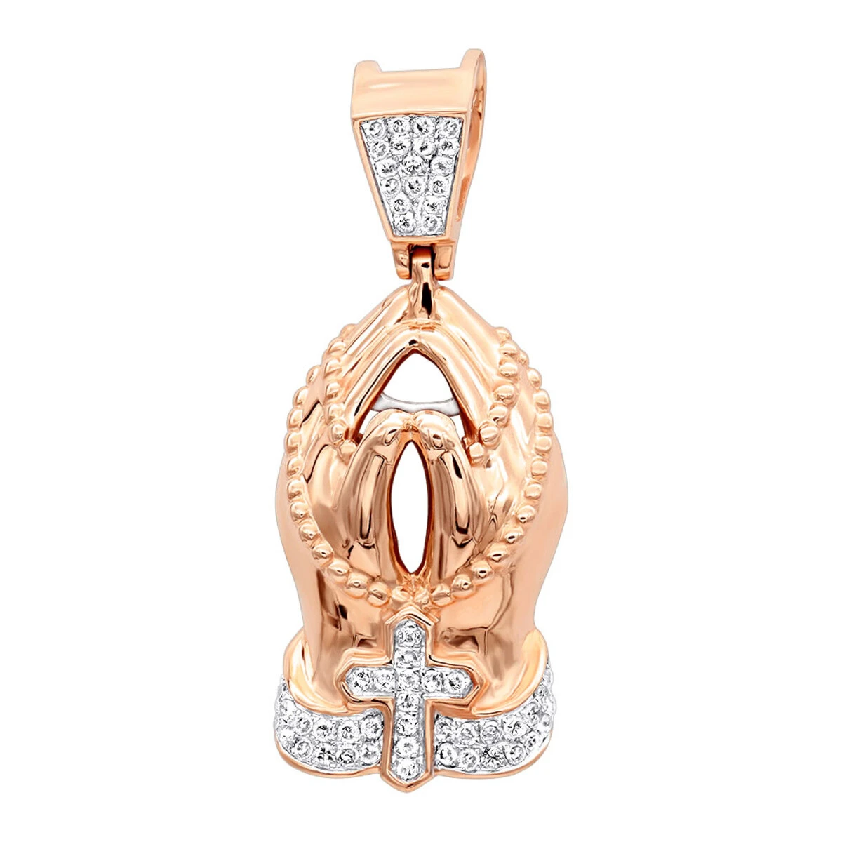 This Mini Praying Hands and Cross Diamond Pendant For Men is done in solid 10k gold and is decorated with 0.25 carats of genuine diamonds, this mini men’s diamond pendant features hands in prayer holding a rosary with the cross, with hands and cross tastefully decorated with round pave set diamonds. This praying hands diamond pendant is available in 10k yellow gold, white gold and rose gold, get yours today! You also can personalize this piece or check we’ve already made and create your own design.