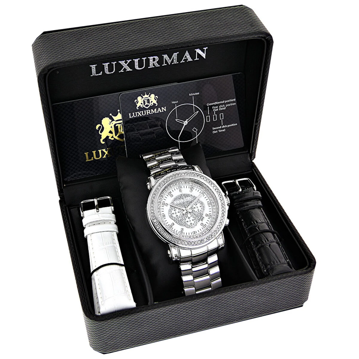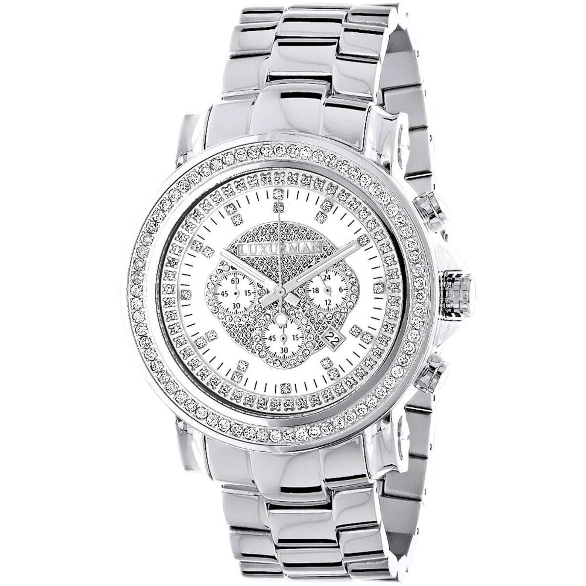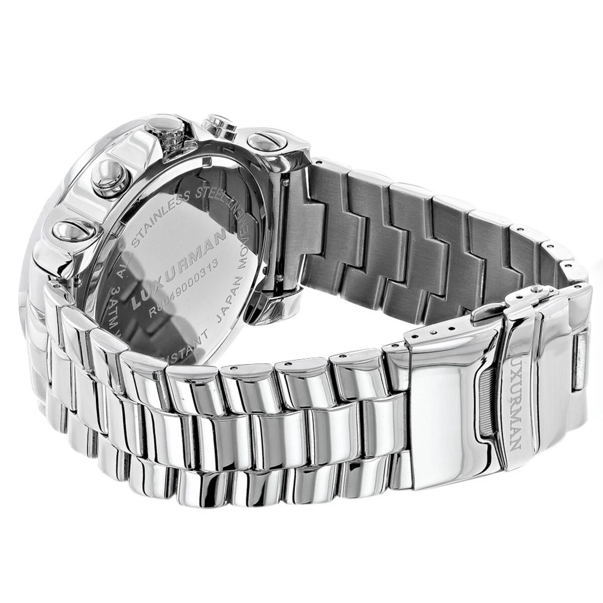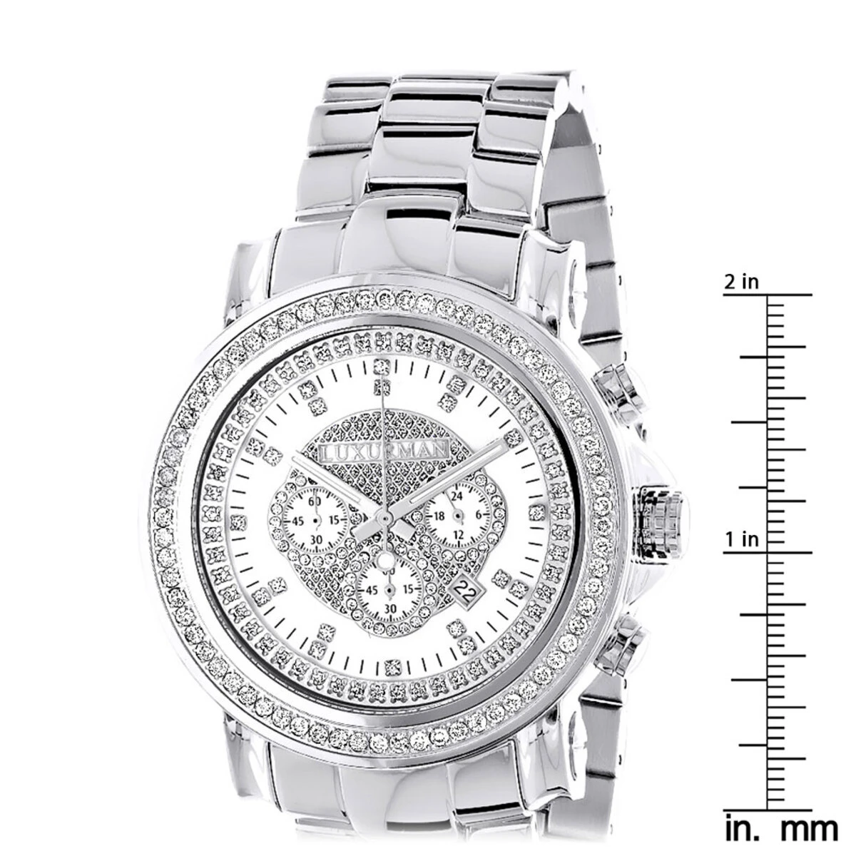 This Oversized Luxurman Men’s Diamond Watch Chronograph features 2.5 carats of genuine diamonds, a white gold plated stainless steel case and a white gold plated stainless steel band. The dial of this LUXURMAN wrist watch showcases three white mother of pearl subdials with date and chronograph. This men’s diamond watch makes a great present for somebody who is not afraid to stand out in a crowd.