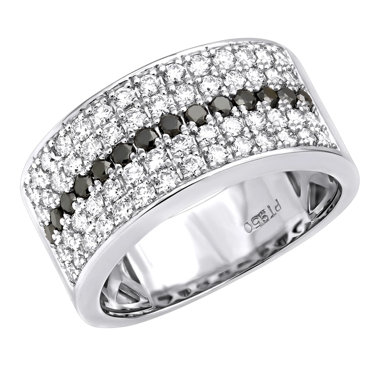 From our diamond wedding rings collection: This extremely stylish and highly unique Platinum 5 Row Black and White Diamond Wedding Band for Men and Women by LUXURMAN features 4 rows of dazzling white round diamonds and a row of black diamonds in the middle creating a captivating contrast. This diamond ring is made in Platinum and can be a very unique diamond wedding band as well as an everyday ring or even a pinky ring. This amazing diamond ring is 10mm wide and was designed to stand out. Expertly crafted to meet the highest industry standards this gorgeous platinum band will last you a lifetime and never lose it’s majestic ambience!