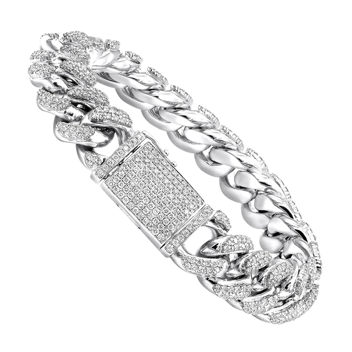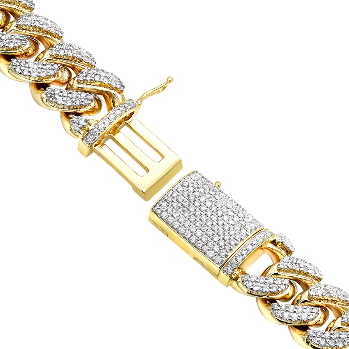 From our men’s diamond bracelets collection This luxurious Diamond Miami Cuban Link Chain Bracelet For Men was made of solid 10k gold and iced out with 8.5 carats of sparkling pave set round diamonds for true ambassadors of style and wealth. The bracelet is over half an inch wide: 9/16in (14mm), pretty heavy at around 140 grams (in 8.5 inches) and is available in 14k white gold, yellow gold and rose gold and can be custom made in any length. The bracelet is made from a heavy Miami Cuban Link Chain with each link set with diamonds, the centerpiece of this statement-making men’s diamond chain bracelet featuring a total of 8.5 carats of white rounds diamonds is a fully iced out dazzling clasp with a safety feature. Wrap your wrist with endless brilliance with this eye catching Miami Cuban Link Diamond Bracelet!