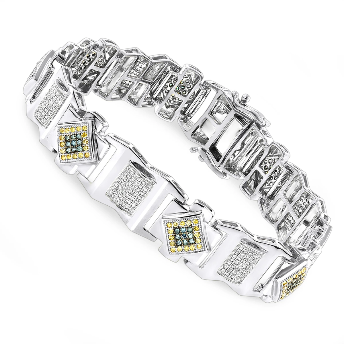 This fantastic Solid Gold Men’s Diamond Bracelet with Yellow Blue White diamonds showcases 2.5 carats of pave set round diamonds. Featuring an intricate design and a highly polished gold finish, this men’s fancy color diamond bracelet is available in 10k or 14K white, yellow and rose gold.