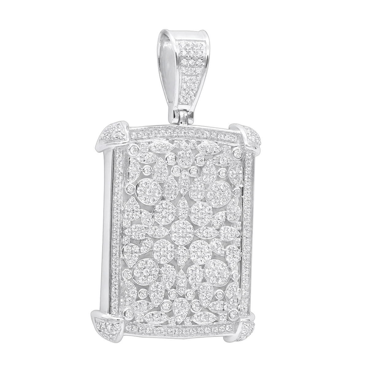Form our men’s diamond pendants collection This solid 10K gold diamond dog tag pendant for men with flower setting weighs approximately 16.5 grams and showcases 3.25 carats of pave and bezel set round diamonds. Featuring a unique design of sparkling diamonds stylishly scattered on the tag surface and on the outline this fantastic dog tag pendant is available in 10K white gold, yellow gold and rose gold. The pendant is quite large at over 2 inches long: 2 1/5in. (55mm) and 1 4/16 (31mm) wide. Such an exceptional design of this white diamond dog tag pendant makes it a perfect present for any occasion and will be a striking addition to any look. Please note that chain is for illustration purposes only and is sold separately. You also can personalize this piece or check we’ve already made and create your own design.