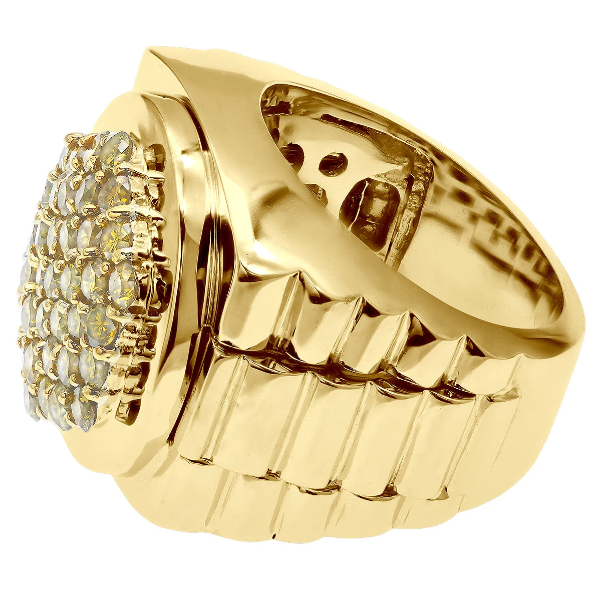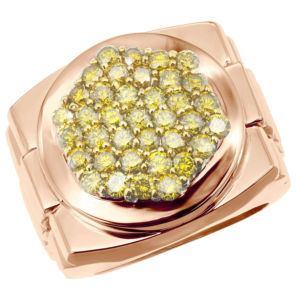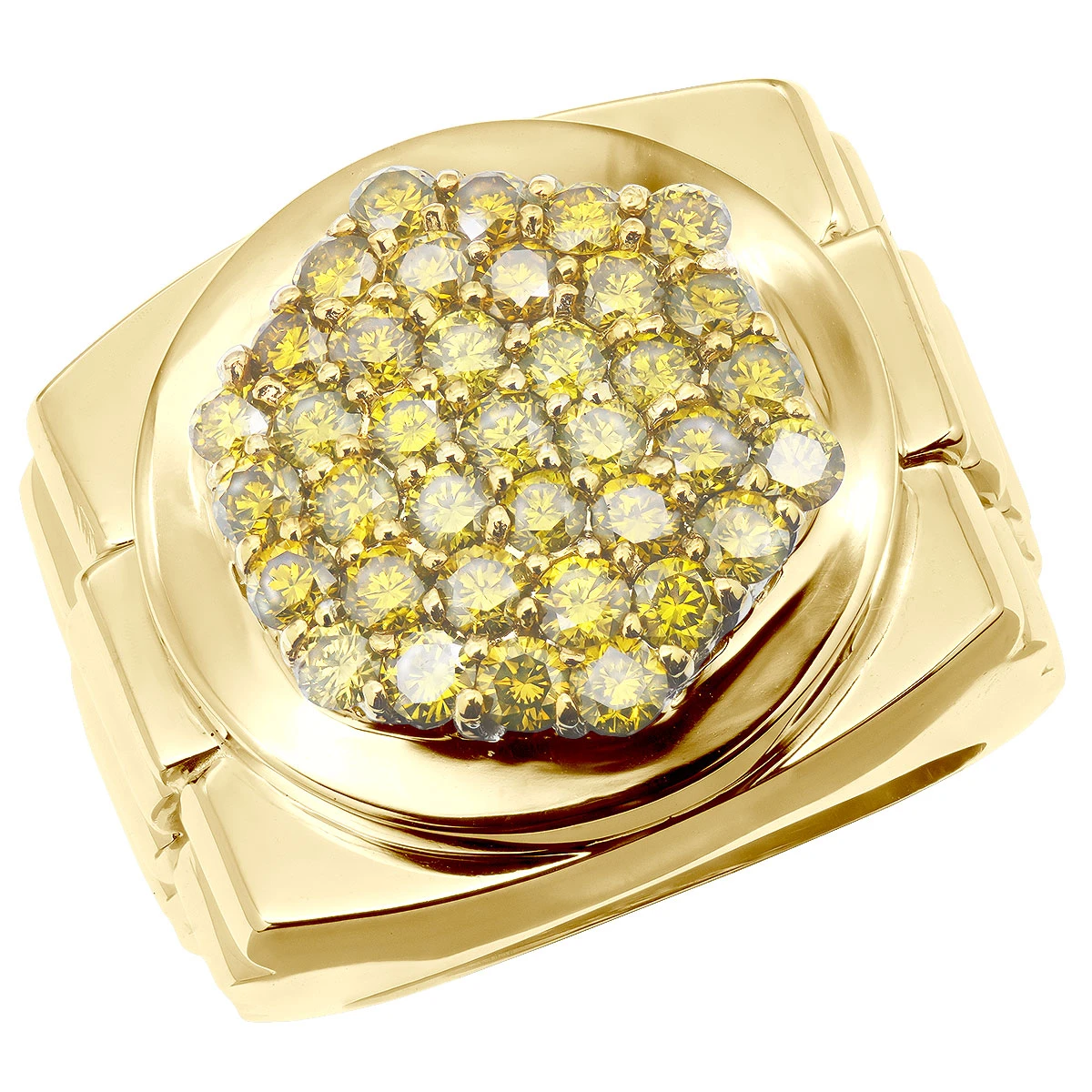 From our men’s diamond rings collection: For our yellow diamonds fans, this very unique 2 Carat Yellow Diamond Ring For Men is made in solid 14k Gold with Pave Round Yellow Diamonds totaling 2 carats, features superb craftsmanship and a modern design with sophisticated diamonds arrangement. The 14K gold band is highly polished, and quite large at 21mm wide. The ring weighs almost 30 grams and is available in 14K white, yellow or rose gold of your choice and can be custom ordered in 18k gold and Platinum. This ring can also be customized with different color diamonds and gemstones, please reach out to us for details or if you would like us to customize it to your specifications.