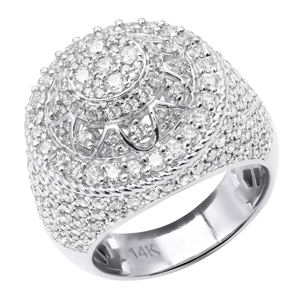 From our men’s diamond rings collection This Unique 4 Carat Diamond Ring for Men in 14K Gold makes a great statement ring or a pinky ring and showcases a spectacular design and expert craftsmanship. Blazing diamonds illuminate this wide ring, adding a striking radiance to the voluminous shape. With impressive 4 carats of precious stones glittering seductively against the beautiful golden ornamentation and each other, this ring will not leave anyone indifferent. The ring is 13/16in (20mm) wide and weighs approximately 16 grams. It is available in 14K white, yellow or rose gold and will look fantastic in any color of your choice.