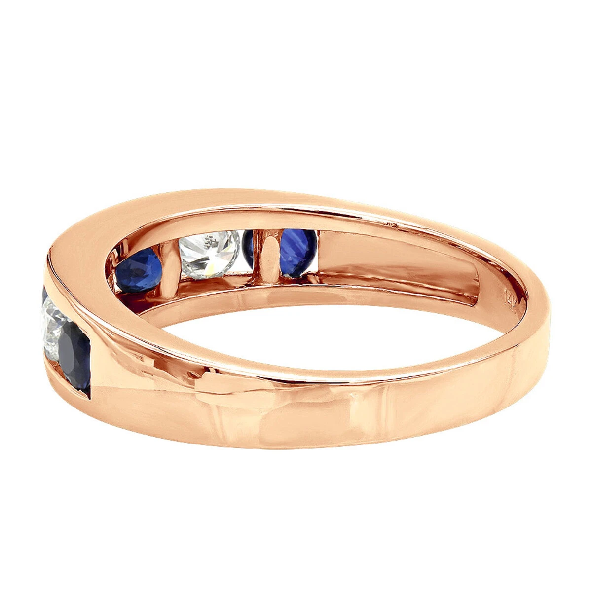 This unique Channel Set Round Cut Sapphire and Diamond Ring for Men & Women in 14K Gold can be worn as a unique wedding band or a 7 year anniversary ring and showcases a 7 stones totaling 1.5 carats of sparkling natural white diamonds and blue sapphires. The channel setting is a secure way to set round cut diamonds and sapphire in a row into the band of the ring, making a metal channel of sparkling stones flush with the shank. The diamonds and sapphire are set closely together into the grooves of the channel and decorate the sides of the band. This setting is popular for wedding bands as it provides securely and stylish setting showcasing the stones. This unisex sapphire and diamond band is available in 14k yellow, rose and white gold, as well as 18k gold and Platinum as a custom order and can be customized with any color and quality diamonds and gemstones. Please contact us if you would like to customize this versatile ring to your specifications.